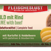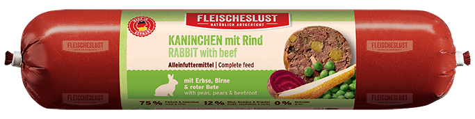 Unser Kaninchen mit Rind mit Erbse, Birne & roter Bete besteht aus 75 % feinstem Fleisch und Innereien vom Kaninchen sowie Innereien vom Rind. 12 % köstliches Obst, knackfrisches Gemüse und wertvolle Kräuter, ergänzt durch hochwertiges, an Omega-3-Fettsäuren reiches Rapsöl, machen unser Alleinfuttermenü natürlich artgerecht.