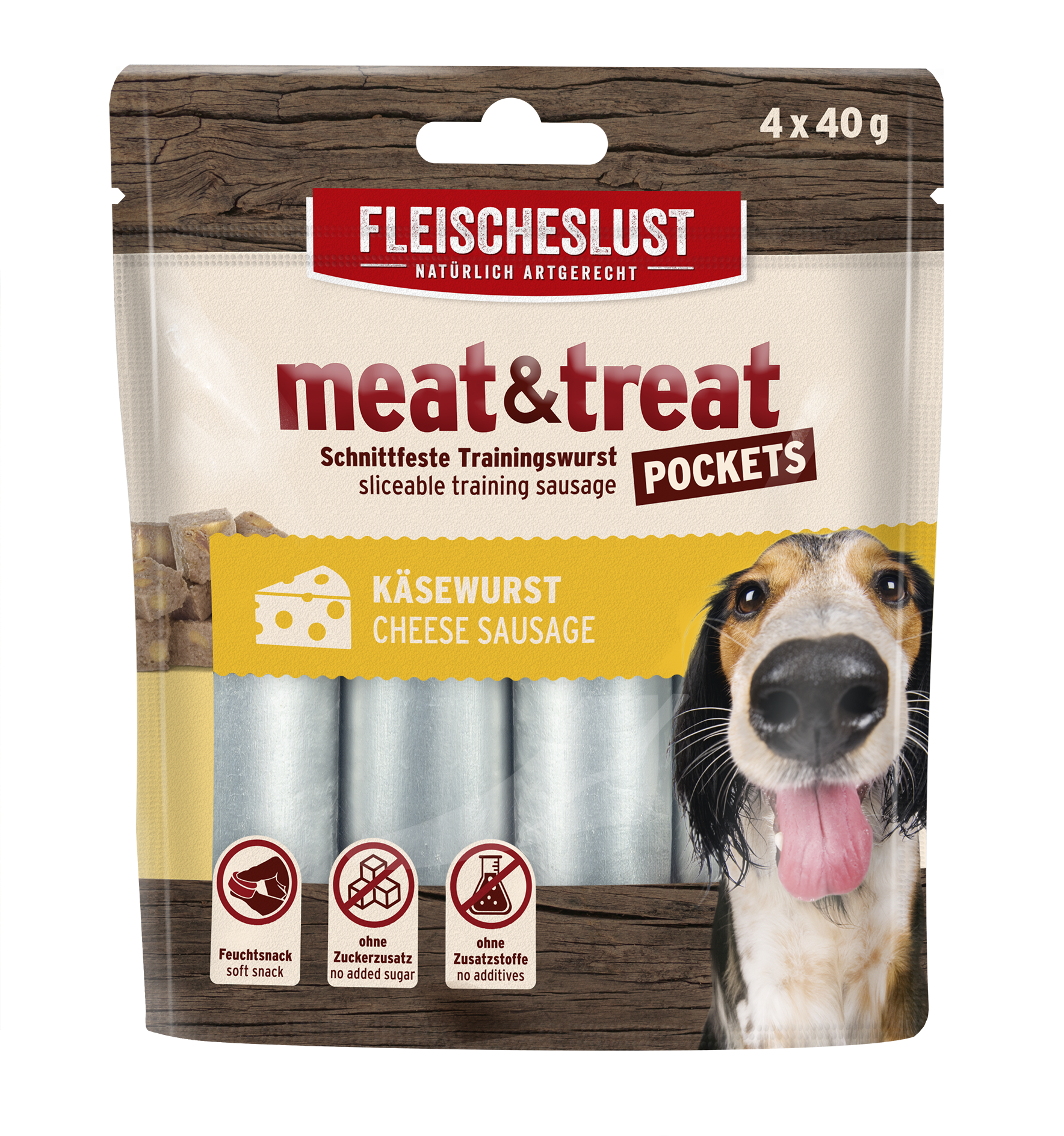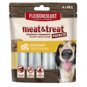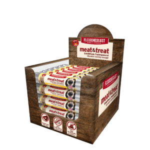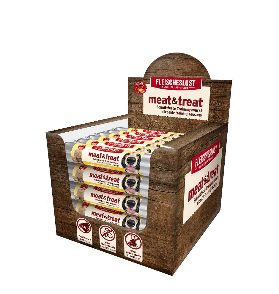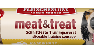 Unsere meat & treat Käsewurst ist eine schnittfeste Trainingswurst und besticht mit hochwertigen, natürlichen Zutaten. Unwiderstehlich lecker für Käseliebhaber! Die Sorte besteht aus 44 % Huhn und 20 % Gouda. Zudem kommt die meat&treat Trainingswurst ganz ohne künstliche Aromen, Farb- und Konservierungsmittel aus. Die Trainingswurst ist leicht zu portionieren und optimal für das Training oder als Belohnungssnack geeignet.