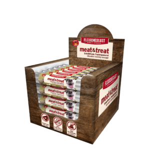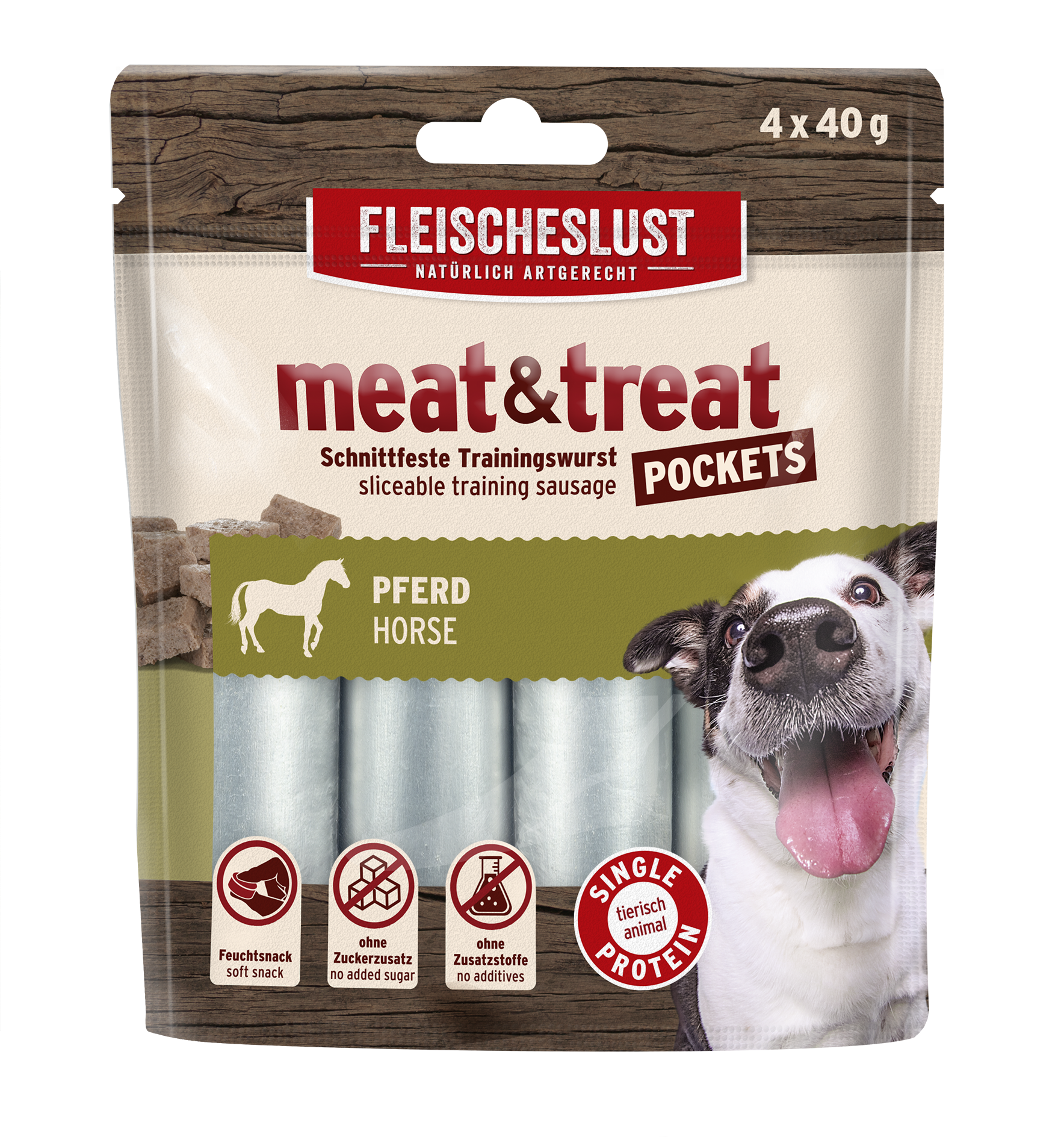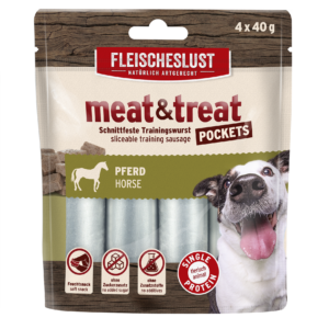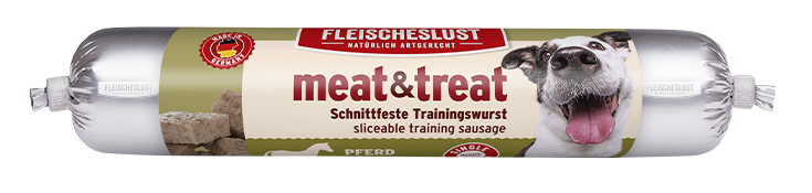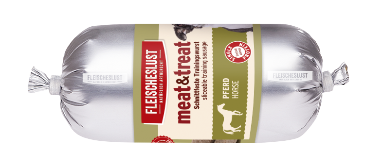 Unsere meat & treat Pferd ist eine schnittfeste Trainingswurst und besticht mit hochwertigen, natürlichen Zutaten. Dabei enthält die Sorte nur ein tierisches Protein aus 61 % bestem Pferdefleisch- und Innereien. Der Feuchtsnack ist dadurch gut bekömmlich und besonders für sensible Fellnasen geeignet. Zudem kommt die meat&treat Trainingswurst ganz ohne künstliche Aromen, Farb- und Konservierungsmittel aus. Die Trainingswurst ist leicht zu portionieren und optimal für das Training oder als Belohnungssnack geeignet.